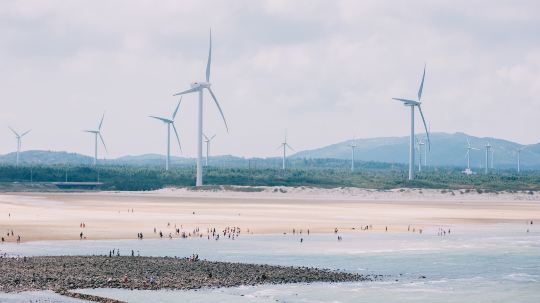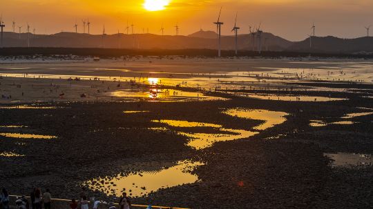 长江澳海滩是平潭三大海滨沙滩之一,沙质细白。拥有福建较大规模的风力发电田,一座座风车排列得错落有致,碧海风车和蓝天白云,美不胜收。