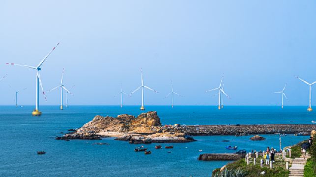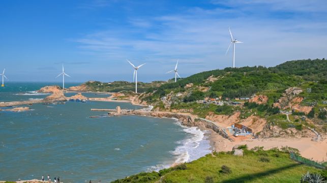 长江澳海滩是平潭三大海滨沙滩之一,沙质细白。拥有福建较大规模的风力发电田,一座座风车排列得错落有致,碧海风车和蓝天白云,美不胜收。